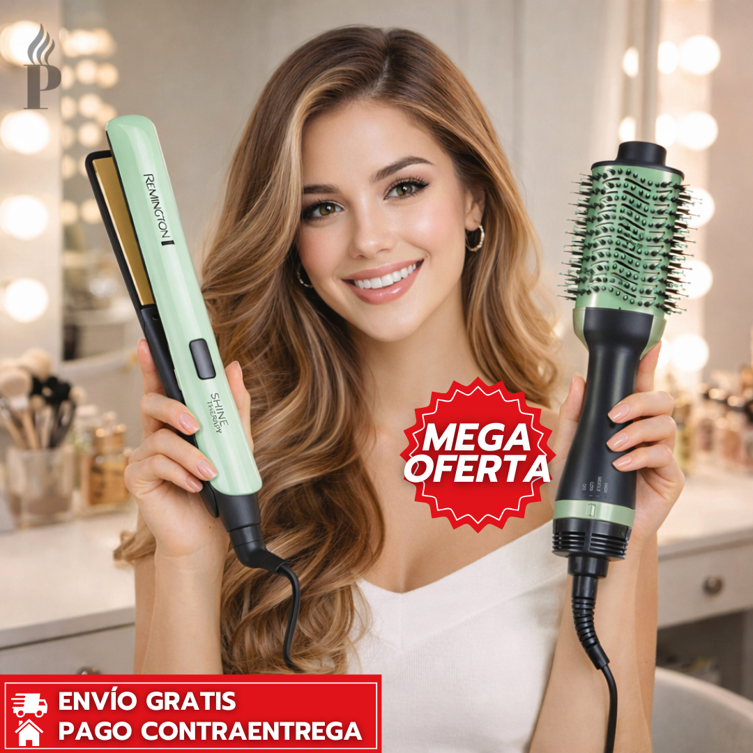 Este combo une la plancha original Remington con tecnología de cerámica infundida en aguacate y macadamia, junto al cepillo secador de alto rendimiento. Ideal para alisar, moldear y proteger tu cabello en menos tiempo.